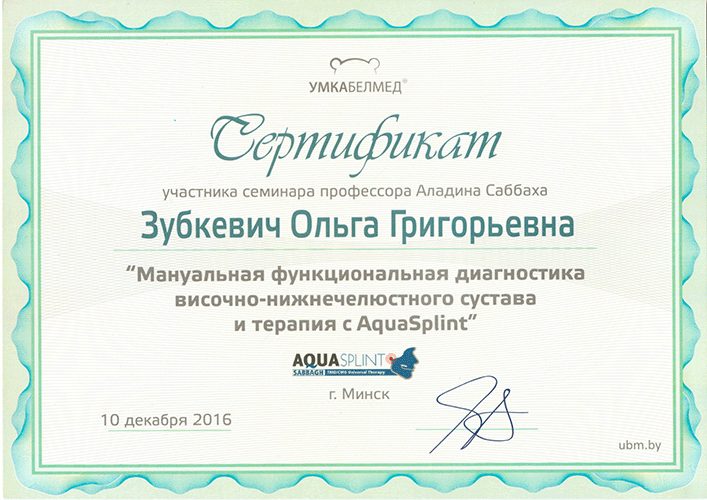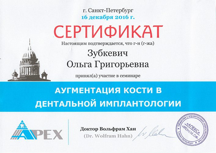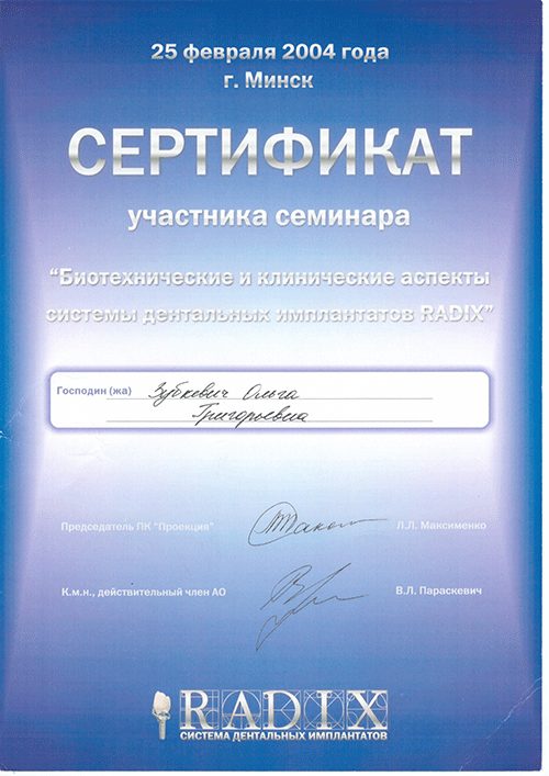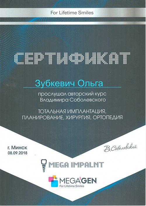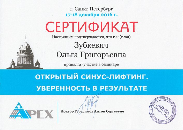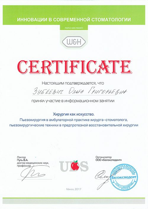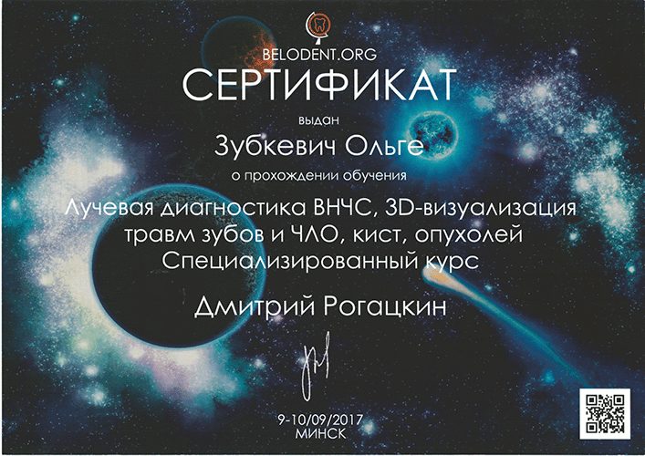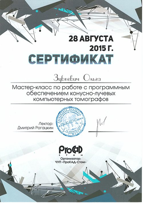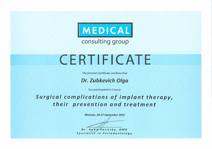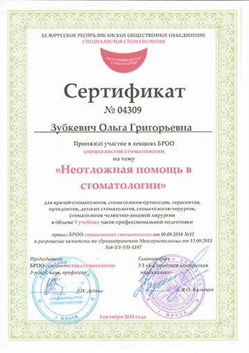 2007 Прошла полный курс переподготовки на на уровне высшего образования по специальности  «стоматология хирургическая».